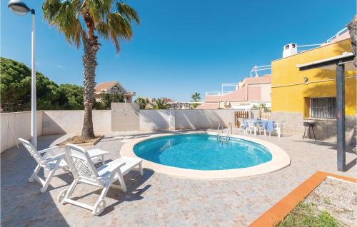 3 Bedroom Nice Home In La Manga se encuentra en La Manga del Mar Menor, a 17 min a pie de Playa El Arenal/Playa Pedrucho, a 1,9 km de Playa de Calafría y a 2,8 km de Playa Lebeche. Esta casa o chalet de 3 estrellas cuenta con parking privado gratis y está a 9 min a pie de Playa Calnegre. Esta casa o chalet consta de 3 dormitorios, una sala de estar, una cocina totalmente equipada con nevera y cafetera, y 1 baño con ducha. Se ofrece TV. Puerto deportivo Tomás Maestre está a 10 km del alojamiento, y La Manga Club está a 16 km. El aeropuerto (Aeropuerto internacional Región de Murcia) está a 56 km.