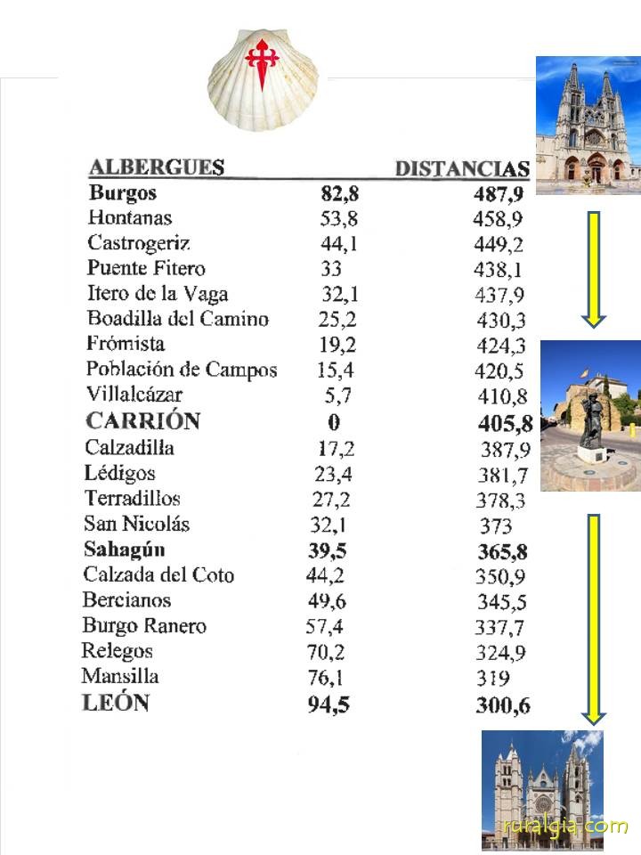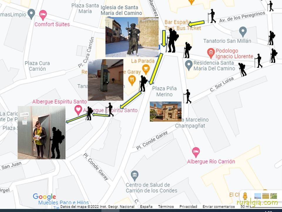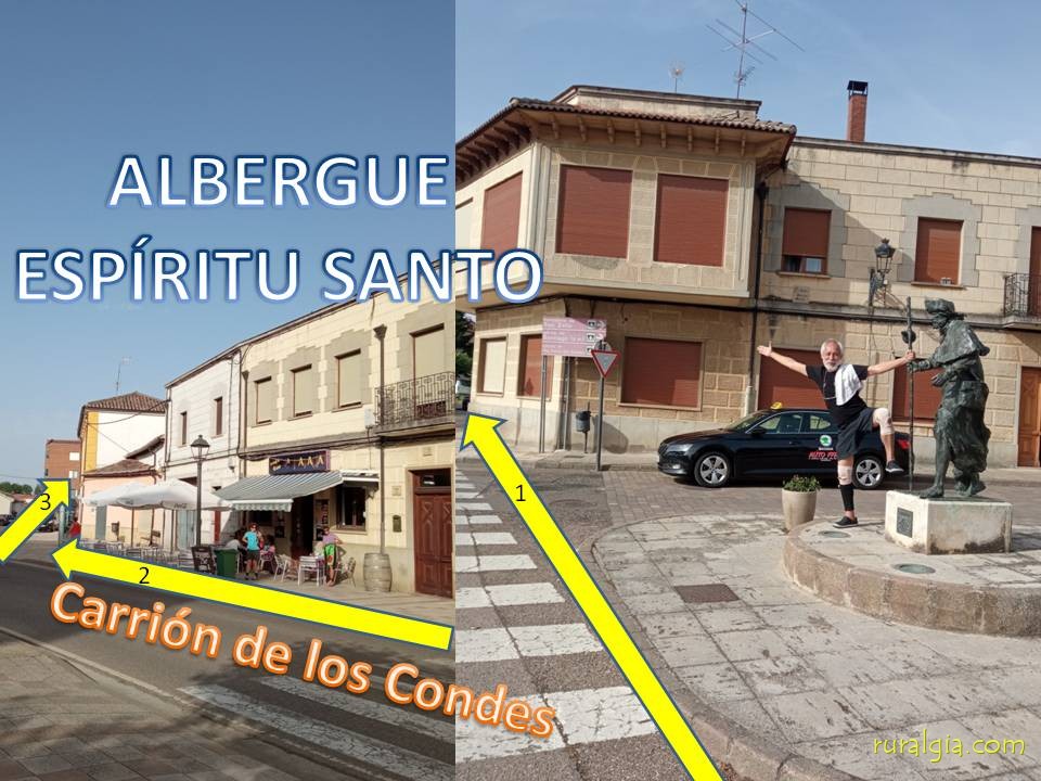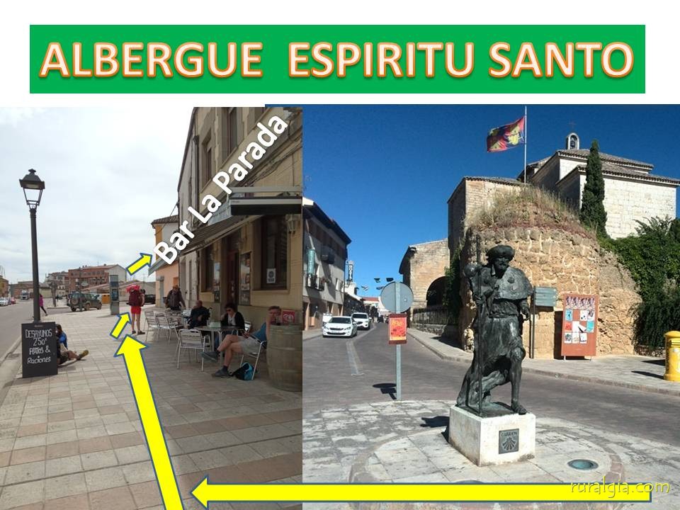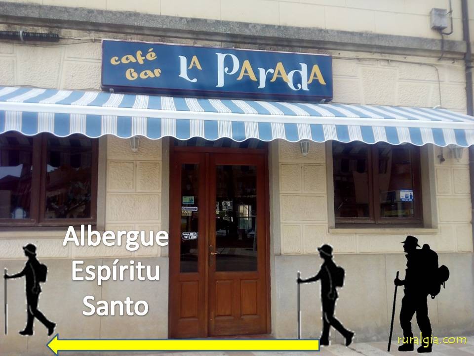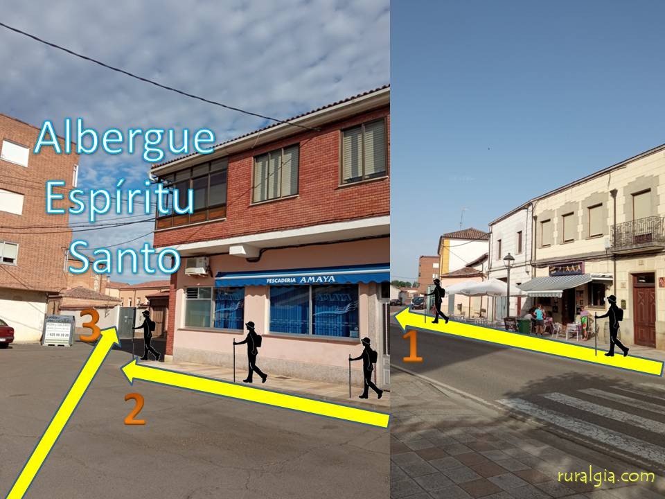 1.- Llegar a la imagen del peregrino; 2.- Bar la Parada, a la izquierda; 3.- Pescadería Amaya. 4.- Albergue Espíritu Santo.