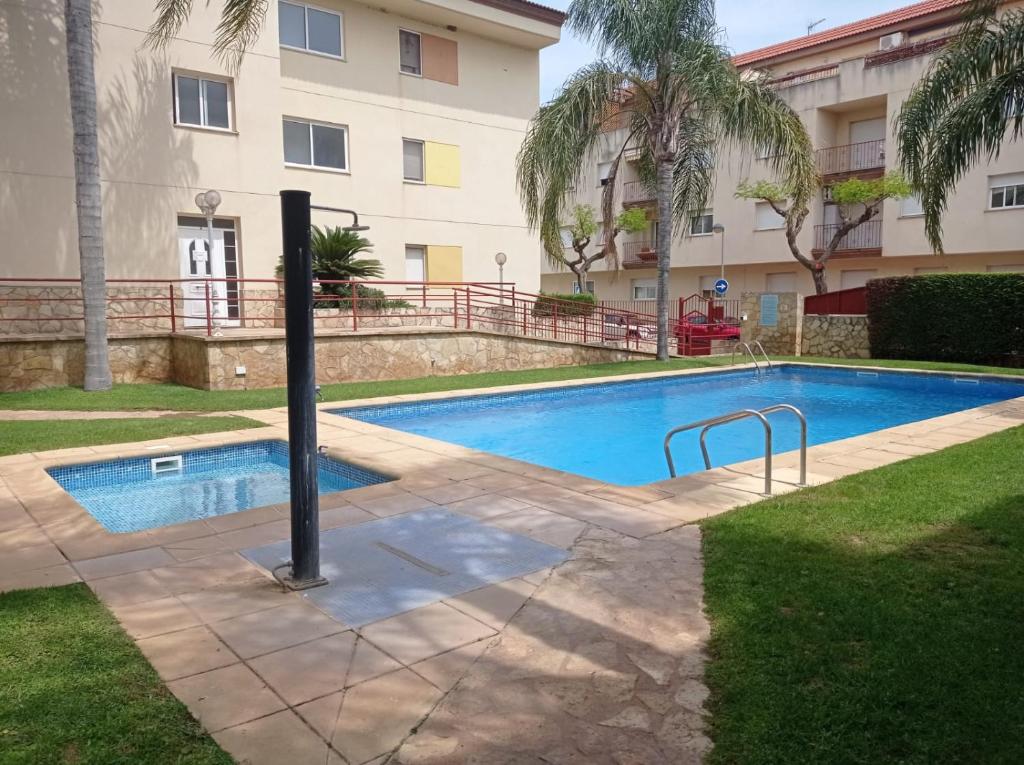 Apartamento con piscina, que tiene piscina al aire libre, jardín y terraza, dispone de alojamiento en Les Cases d'Alcanar con wifi gratis y vistas a la piscina. Este alojamiento con vistas al jardín ofrece balcón. Este apartamento con aire acondicionado consta de 3 dormitorios, una sala de estar, una cocina totalmente equipada con nevera y cafetera, y 1 baño con bidet y ducha. Hay toallas y ropa de cama en el apartamento. Se puede practicar senderismo en los alrededores. Cerca del alojamiento hay puntos de interés como Playa de Les Cases d'Alcanar, Platja del Marjal y Platja del Camaril. El aeropuerto (Aeropuerto de Castellón ? Costa Azahar) está a 69 km.