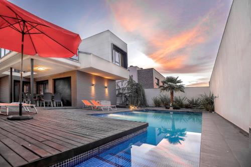 La Casa Duende se encuentra en Guadalajara y ofrece alojamiento con aire acondicionado y piscina privada. El establecimiento cuenta con balcón, aparcamiento privado gratuito y WiFi gratuita. La casa tiene terraza, vistas al jardín, 4 dormitorios, sala de estar, TV de pantalla plana, cocina equipada con lavavajillas y horno y 5 baños con bidet. El establecimiento también dispone de 5 baños con bañera y albornoces, toallas y ropa de cama. También hay un jardín. La casa está a 29 km de la puerta de Madrid y a 49 km de la estación de metro de Canillejas. El aeropuerto más cercano es el de Madrid-Torrejón, ubicado a 31 km de la Casa Duende.