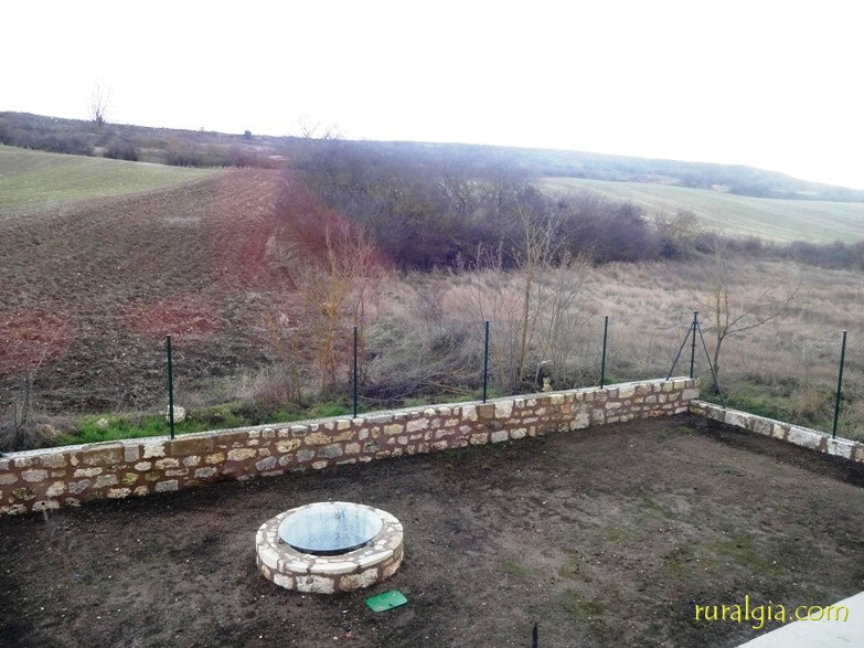 Jardin con barbacoa, mesas y bancos, pozo