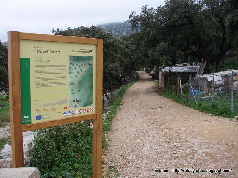 Benaocaz (a 3.00 kms.) Nos situamos en la localidad de Benaocaz, muy cerquita de Ubrique o Grazalema, de hecho es justo el pueblo que está en medio de las dos localidades, sin olvidar a Villaluenga del Rosario, famosa por sus fábricas de queso de cabra payoya. En Benaocaz, justo antes de llegar viniendo de Ubrique, hay un desvío que debemos tomar situado a 500 . Este se dirige a un invernadero y a un hotel llamado los Chozos, donde antes de llegar al alojamiento hay un pequeño parking para 4 ó 5 coches donde podéis dejar el coche. En caso de no haber plazas, unos cientos de metros antes también hay muchos huecos donde abandonar el el automóvil. Comenzaremos por un estrecho sendero que mas adelante cruza un antiguo puente que tarde o temprano se vendrá abajo. Tras cruzarlo seguimos el camino por el lado derecho del río y llegaremos a un punto que es fácil perderse. En lugar de seguir lo que parece el sendero normal, llamado el sendero del moro, por donde discurre la parte principal del arroyo, este tenemos que abandonarlo y subir colina arriba donde llegaremos a un camino que comunica con Benaocaz. Si hubiéramos tomado el sendero incorrecto, habríamos llegado a la parte de abajo del Salto del Cabrero, requiriendo mucho mas esfuerzo al tener que remontar el camino de vuelta. Una vez en el sendero que se dirige a Benaocaz, este lo tomamos en sentido contrario al pueblo, donde cruzaremos una puerta y llegaremos al puerto de Don Fernando, parte que por cierto es bastante llana una vez arriba. Aquí encontraremos una serie de árboles (acebuches, arces y lentiscos) de aspecto terrorífico que en cualquier momento parece que tienen intención de atraparnos bajo sus oscuras ramas. Continuamos el sendero y la verdad que no parece que vayamos a llegar a un lugar como el Salto del cabrero. Parece que se camina por senderos interminables, sin señal alguna de un barranco de piedra como el que estábamos buscando. La larga pradera comienza a bajar, pasando por un campo espectacular que se muestra espléndido en primavera. Este llegará a una zona completamente verde y que perfectamente se podría jugar un partido de fútbol. Lástima que no esté permitida la acampada, dado que es un sitio perfecto para ello. Una vez en la pradera tomamos el camino de la izquierda, que de hecho ya está señalizado!!! y en tan solo 5 minutos llegaremos al mirador del Salto del Cabrero!!, gobernado por unas cuantas familias de buitres, por lo que recomiendo no dejar los prismáticos en casa ó una cámara con un buen zoom. Es increíble el desfiladero que aquí se ha creado, separado por dos grandes paredes verticales llenas de nidos de buitres. Además las vistas no solo acompañan en dirección al salto del cabrero, ya que si nos damos la vuelta veremos a lo lejos el Parque de los Alcornocales, el otro pulmón verde de la provincia. Para volver, no nos queda más remedio que tomar el mismo camino de vuelta dado que la ruta es lineal.