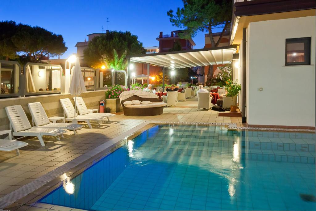 Set in the heart of Bibione, Hotel Kennedy is set on a quiet pedestrian street just 150 metres from Piazzale Zenith beach. It offers a hydromassage pool with sun loungers and parasols and a beach place on request. All rooms come with a balcony overlooking the pedestrian area. Each one is air conditioned and includes a TV, an empty mini-fridge and a private bathroom. A continental breakfast is served each morning and the restaurant offers Italian dishes at lunch and dinner. Drinks are available from the bar that is open all day until midnight. There is also a TV lounge with sofas. The Kennedy Hotel provides free parking and a free WiFi point. It has a covered terrace at the entrance with tables and chairs. There is a second smaller swimming pool with hydromassage for children, plus a play area and a table tennis on the terrace. The private beach is 200 metres away. Bibione's popular shopping street, Via delle Costellazioni is just 50 metres away.