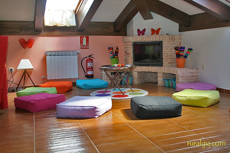 * Zona de reláx con cojines grandes alrededor de la chimenea para meditaciones,charlas,juegos etc.