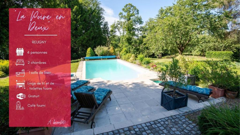 La Poire en deux está en Reugny, a 14 km de Estación de tren de Amboise, y dispone de alojamiento con piscina al aire libre, parking privado gratis y jardín. El alojamiento se encuentra a 16 km de Castillo de Amboise, a 16 km de Castillo de Clos-Lucé y a 21 km de Centro de congresos Vinci Internacional. El hostal o pensión libre de humo ofrece wifi gratis en todo el alojamiento. Las unidades están equipadas con nevera, lavavajillas, cafetera, ducha, secador de pelo y escritorio. En el hostal o pensión, cada habitación cuenta con terraza, baño privado y TV. La recepción ofrece consejos de forma ininterrumpida, y el personal habla inglés y francés. Estación de tren de Tours está a 21 km del alojamiento, y Museo Hotel Goüin está a 21 km. El aeropuerto (Aeropuerto de Tours Val de Loire) está a 16 km.