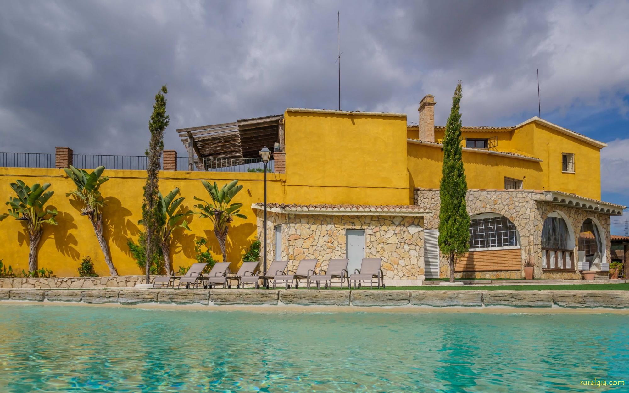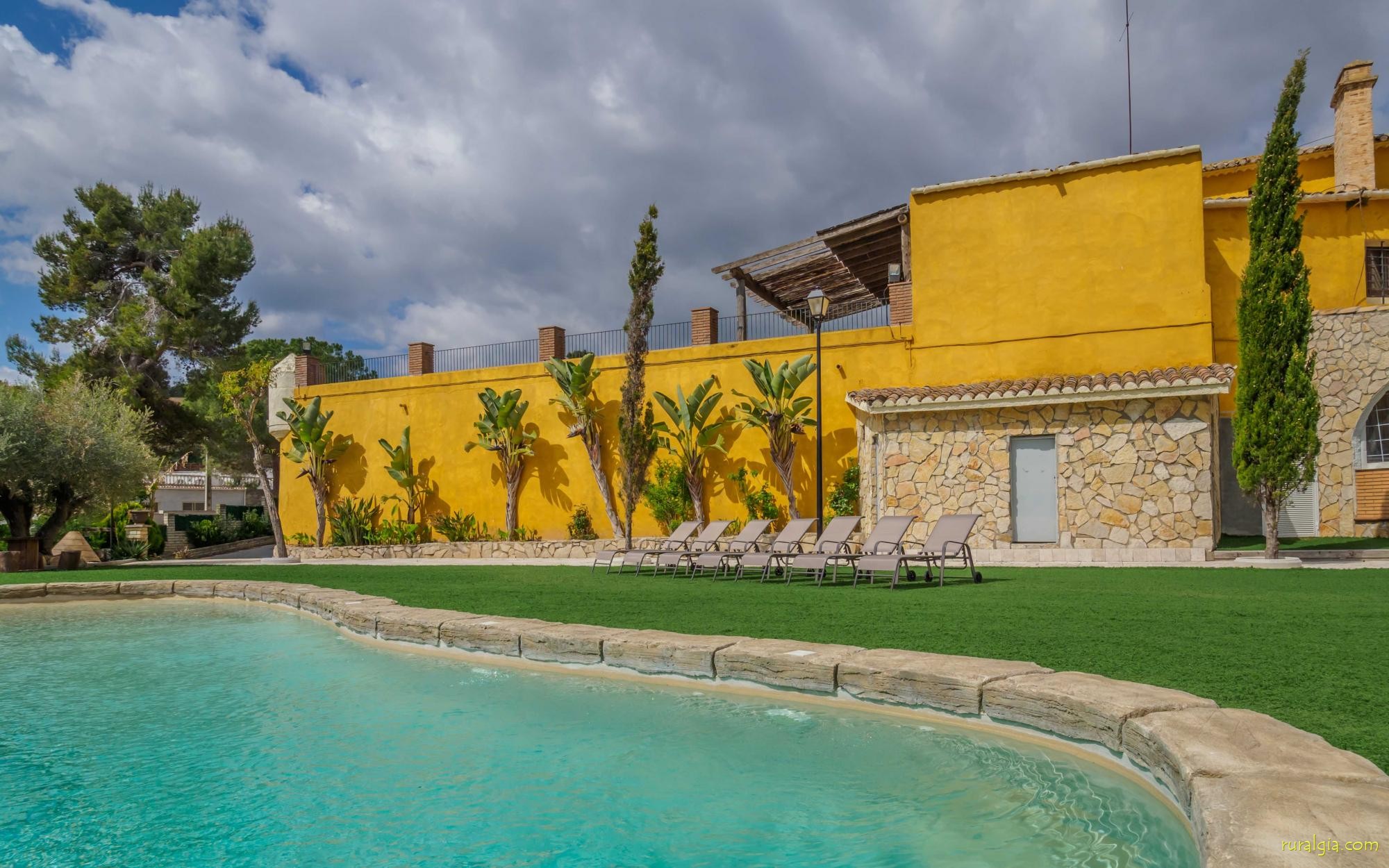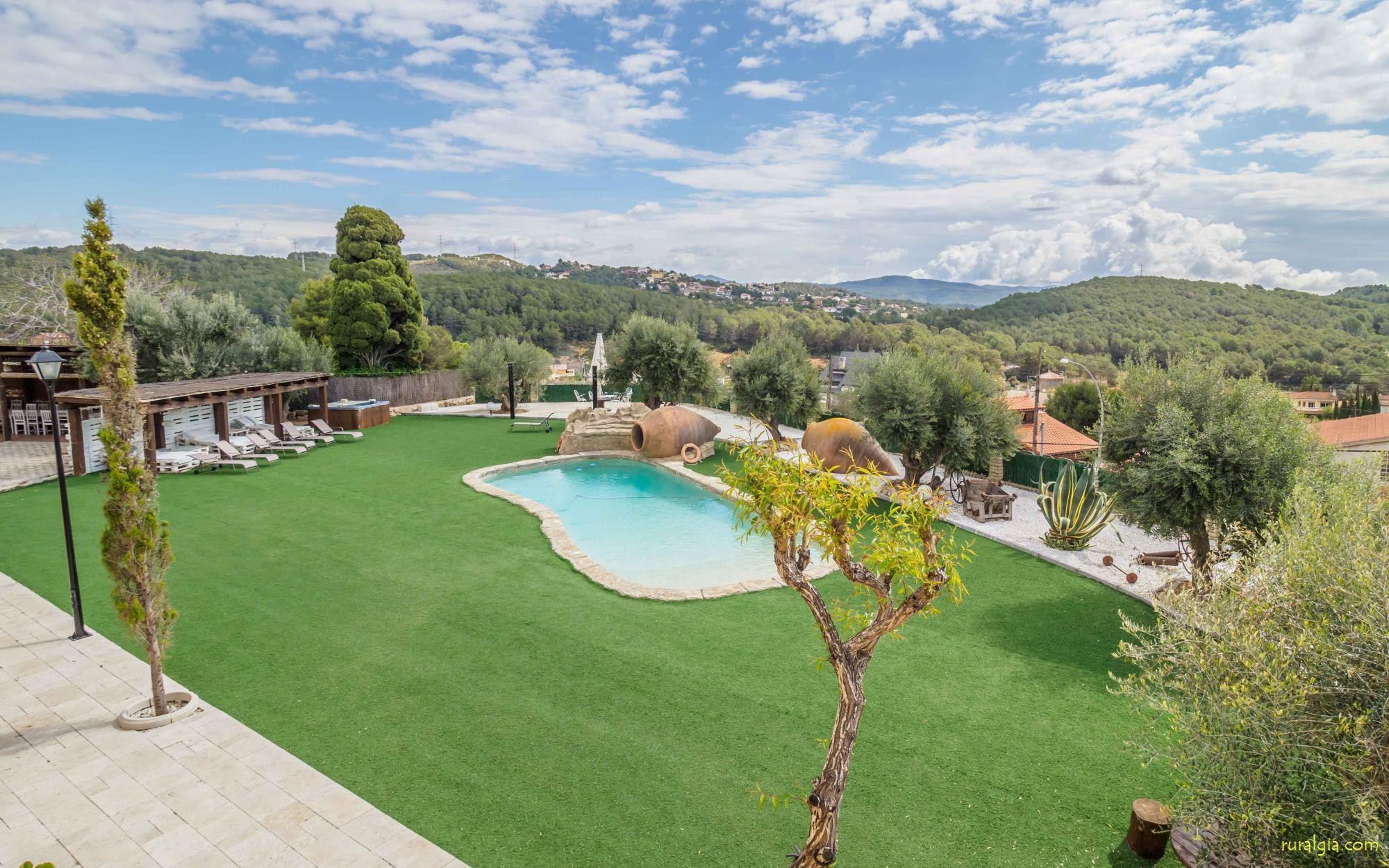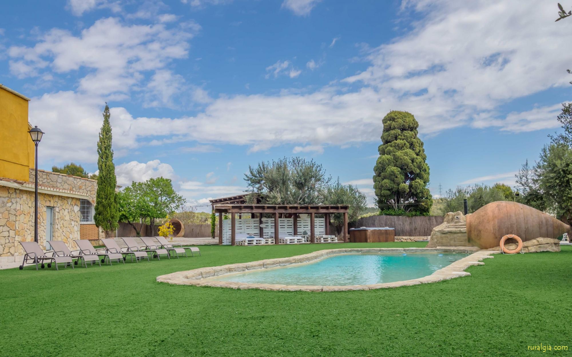 En las zonas exteriores encontrará una diversidad de espacios destacando una gran piscina tipo playa con hidromasaje con una cascada de agua, zona de hamacas chill-out y jacuzzi. Además, dispone de un comedor exterior, una barbacoa y un amplio porche con sillones.
