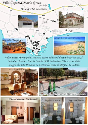 Villa Capozza Maria Greca se encuentra en Le Castella, a 14 min a pie de Playa de Gigli, y ofrece alojamiento con jardín, parking privado gratis, salón de uso común y terraza. El alojamiento ofrece bar y se encuentra a 2,3 km de Playa de Santa Domenica. El alojamiento dispone de karaoke y servicio de conserjería. En el hostal o pensión, todas las habitaciones tienen armario. Todas las habitaciones disponen de baño privado y aire acondicionado, y algunas tienen además balcón. En Villa Capozza Maria Greca se sirve todas las mañanas un desayuno italiano. Ruinas de Capo Colonna está a 23 km del alojamiento, y Le Castella Castle está a 3 km. El aeropuerto (Aeropuerto de Crotone) está a 11 km, y el alojamiento ofrece servicio de traslado de pago para ir o volver del aeropuerto.