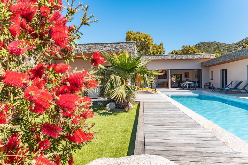 Villa Galice Macchia Di Lecci se encuentra en Lecci, a 14 km de Puerto de Porto Vecchio y a 39 km de Puerto de Bonifacio, y ofrece alojamiento con wifi gratis, aire acondicionado, piscina de temporada al aire libre y terraza. Esta villa tiene piscina privada, jardín y parking privado gratis. La villa dispone de 5 dormitorios, TV con canales vía satélite, una cocina equipada con nevera y lavavajillas, lavadora y 5 baños con ducha. Hay toallas y ropa de cama en la villa. Former Chapel of the Trinity está a 42 km del alojamiento, y King Aragon Steps está a 41 km. El aeropuerto (Aeropuerto de Figari Sud-Corse) está a 34 km.